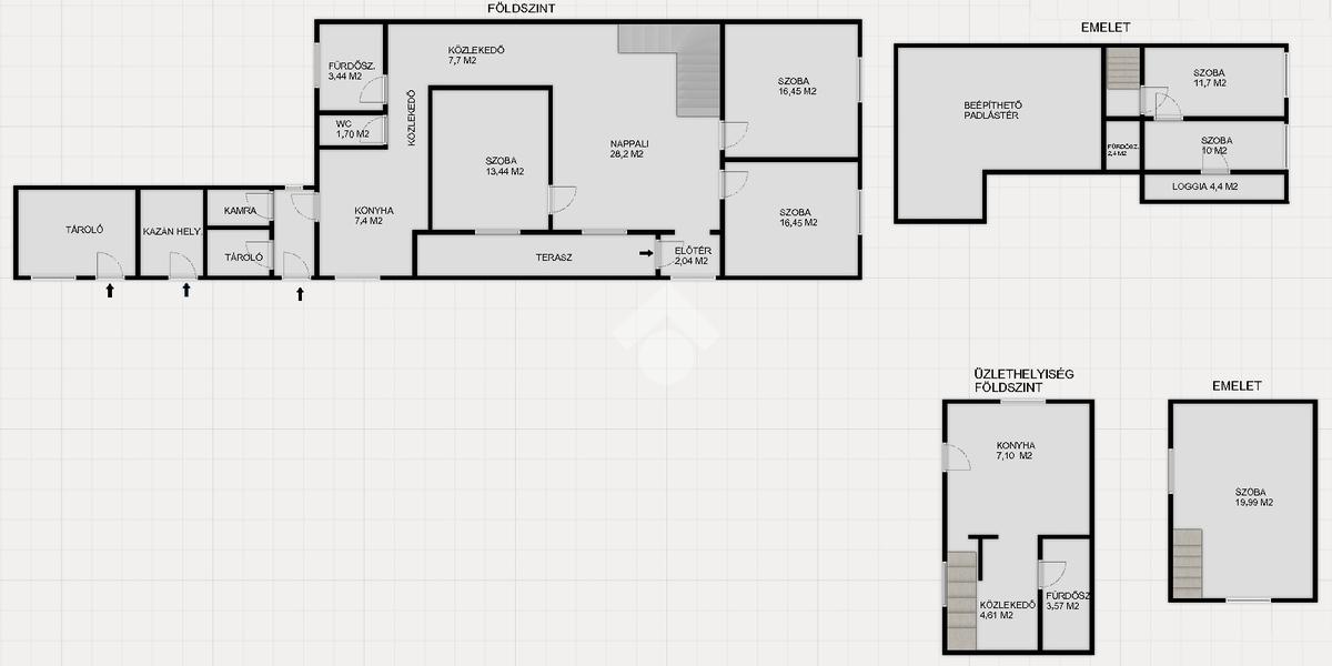 A földszinti részen, konyha, nappali, 3 szoba, kamra, fürdőszoba, előszoba, mellékhelyiség, közlekedő és terasz található, az emeleten 2 szoba, fürdőszoba és erkély kapott helyet. A tetőtér nincs teljesen beépítve.