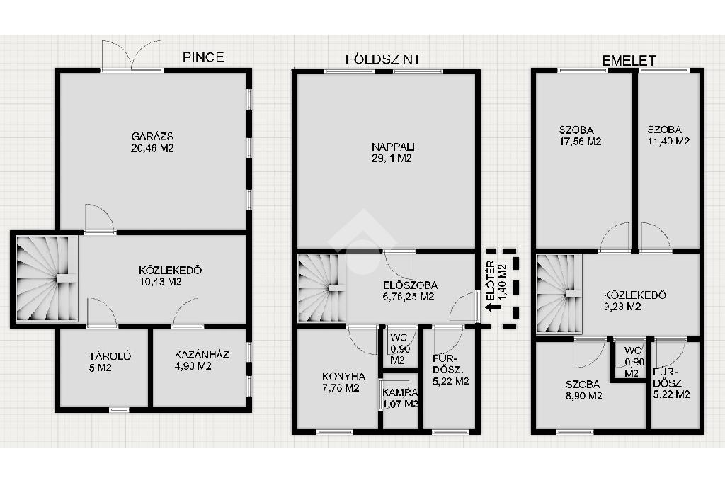 A földszinten konyha, egy tágas nappali (igény esetén a nappaliból még egy szoba leválasztható), fürdőszoba és beépített terasz található. Az emeleten 3 szoba, nappali, fürdőszoba, illetve a padlásfeljáró kapott helyet. A ház alatt egy 41 m2-es pince van, ahol a kazánhelyiség, garázs és tároló került kialakításra.