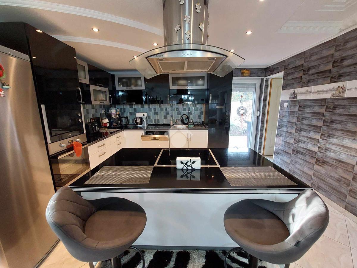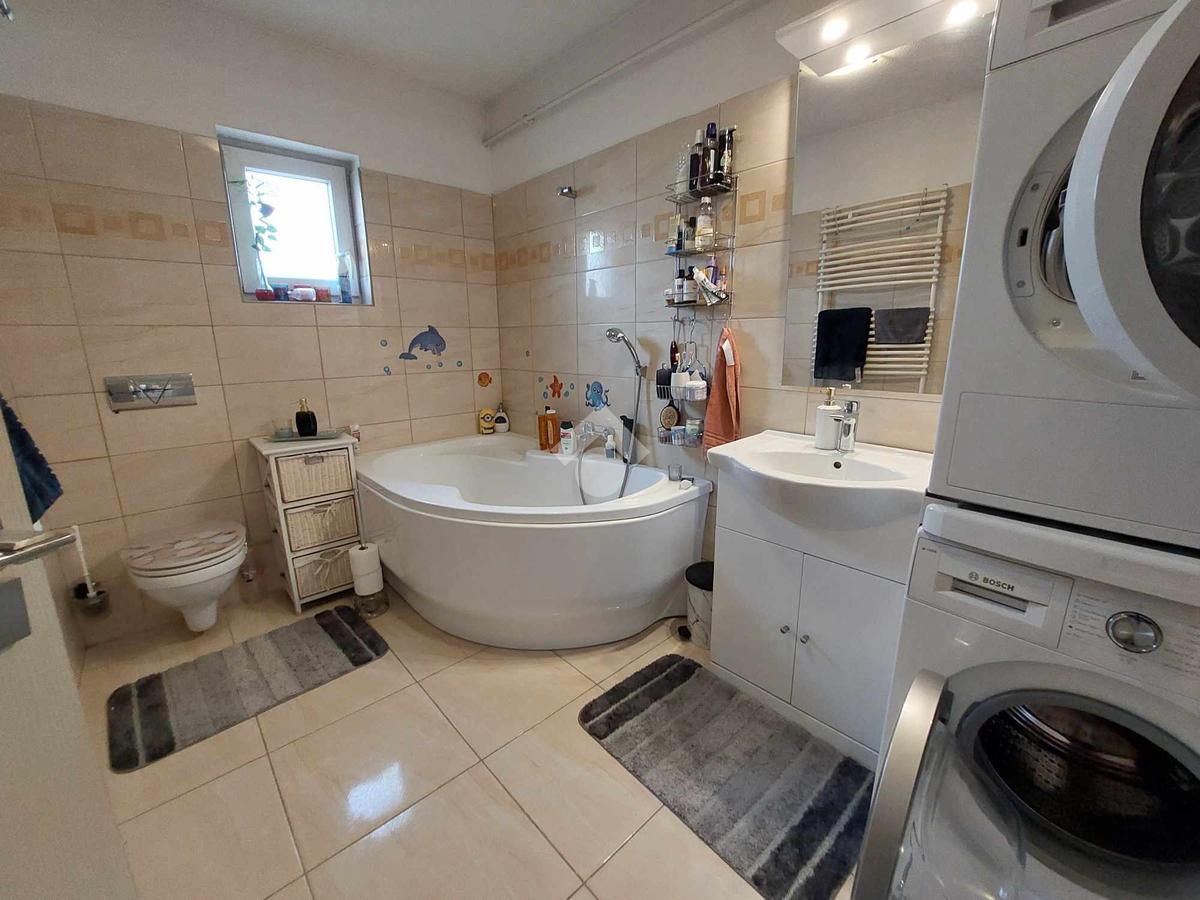 A fűtést padlófűtés és kombi cirkó biztosítja, és hűtő-fűtő klíma is rendelkezésre áll. A kertre néző teraszt a nappaliból lehet megközelíteni. Tartozik a házhoz garázs, fedett autóbeálló és a telek végében kerti sütögető hely is kialakításre került.