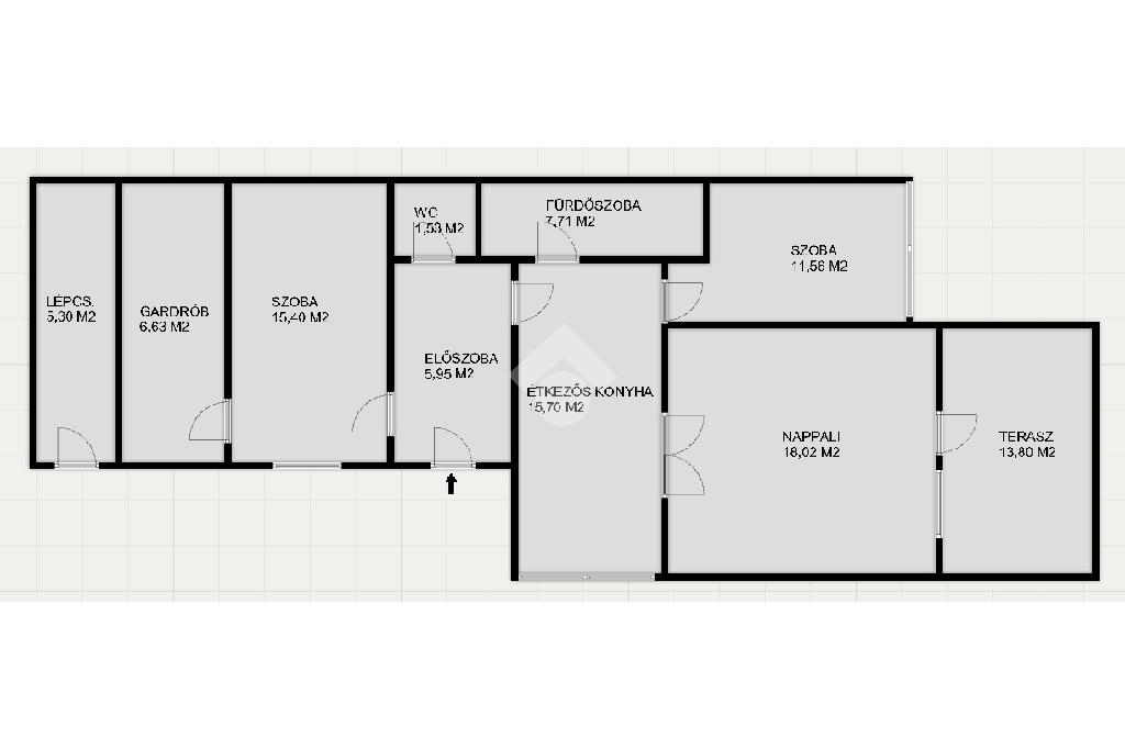 A 83 m2 földszinti lakás részei: előszoba, étkezős konyha, nappali, 2 hálószoba, gardrób, fürdőszoba, wc, terasz.