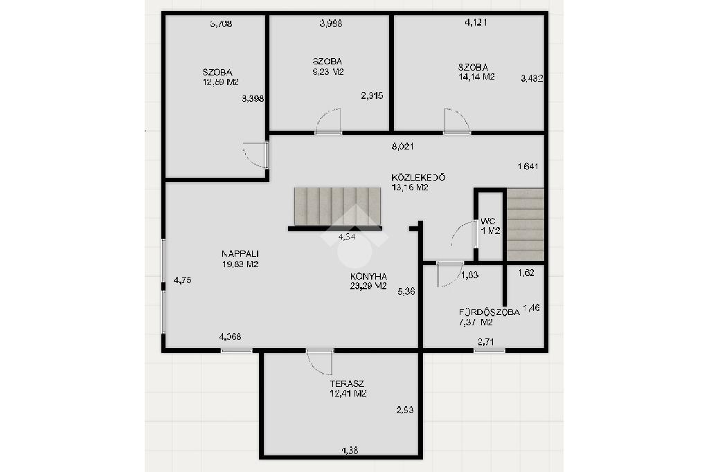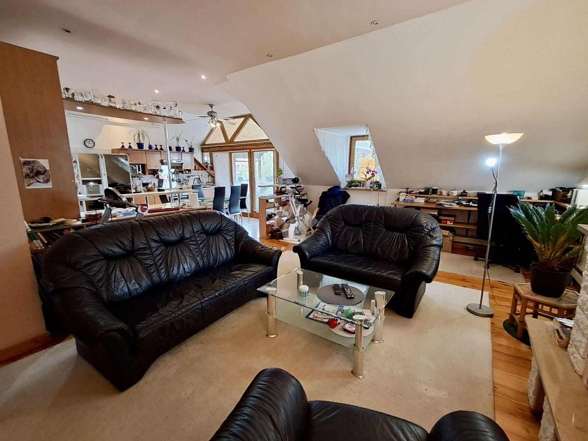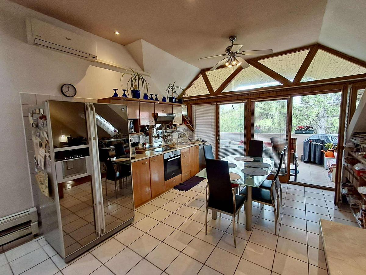 Téglaégetésű, az 1990-es években épült, esztétikai és műszaki felújítást igényel. Összesen 6 szoba, 2 konyha, 2 fürdőszoba, tároló, pince áll rendelkezésre. A fűtést kombi cirkó és 4 db hűtő-fűtő klíma biztosítja. Tartozik az ingatlanhoz egy 20 m2 terasz és egy 12 m2-es erkély. Az alsó és a felső szinten a mérőórák külön vannak.
