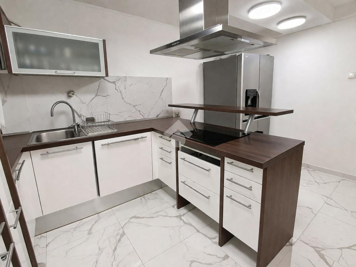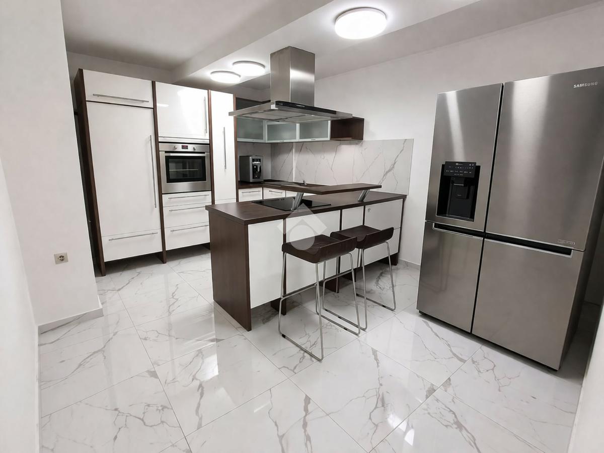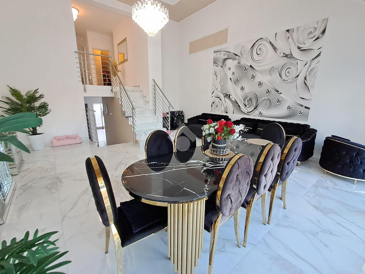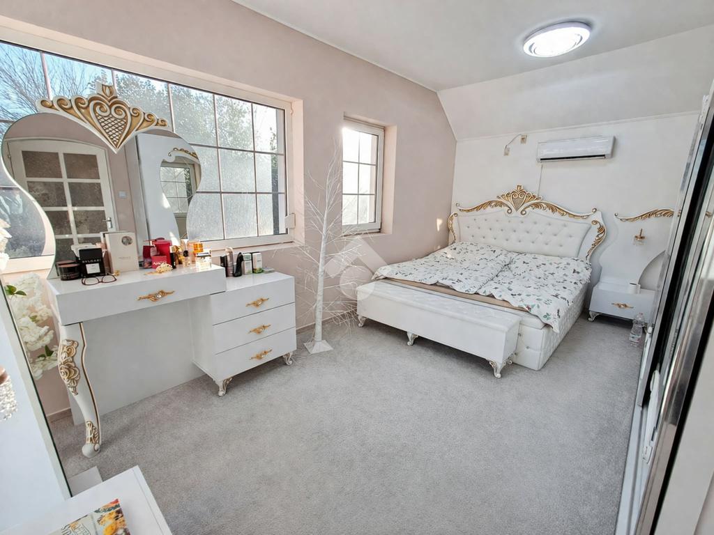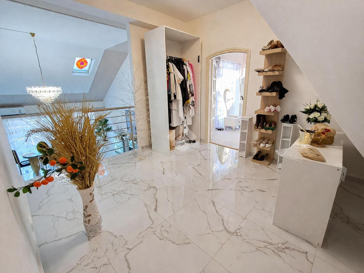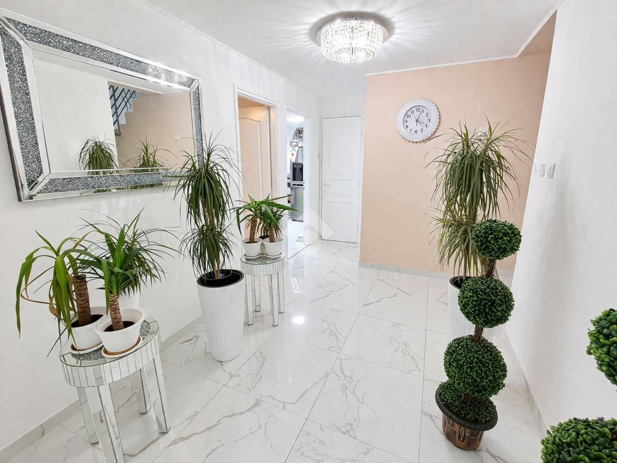 A földszinti (84,5 m2) és a félemelet (35 m2) részben 3 szoba, konyha, hall, gardrób szoba, közlekedő, fürdőszoba és mellékhelyiség és terasz került kialakításra.