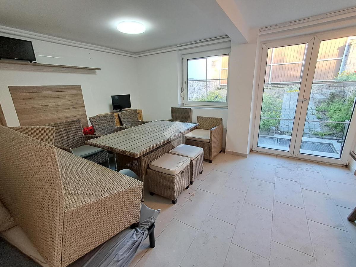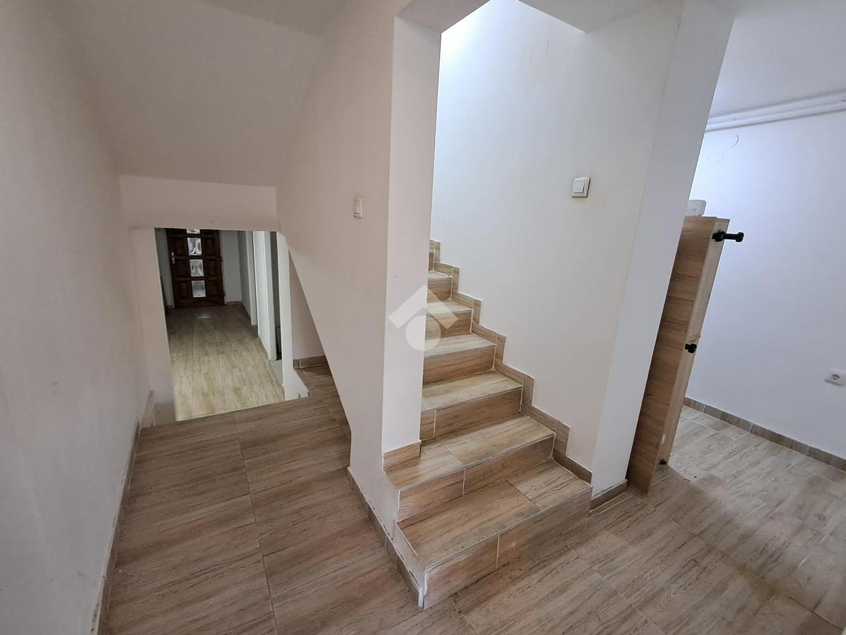 A félszuterén rész 82 m2-es: 3 szoba, konyha, kamra, közlekedő, fürdőszoba és a kazánhelyiség áll rendelkezésre. Ez a rész irodaként funkcionált, jelenleg is bérlik.