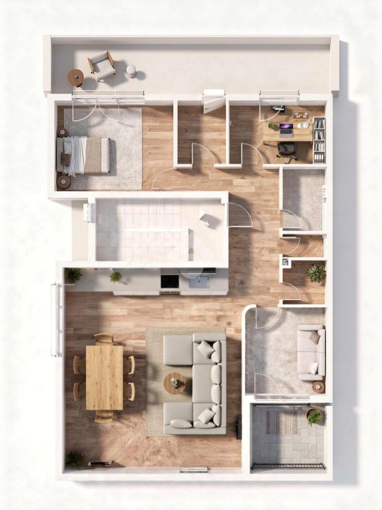 A lakásban egy 44 m2-es amerikai konyhás, étkezős nappali, 3 szoba, 2 fürdőszoba, előtér, közlekedő, mellékhelyiség és 2 terasz található (7 m2+ 23 m2). Gyönyörű, egyedi, minőségi burkolatok lettek beszerelve.