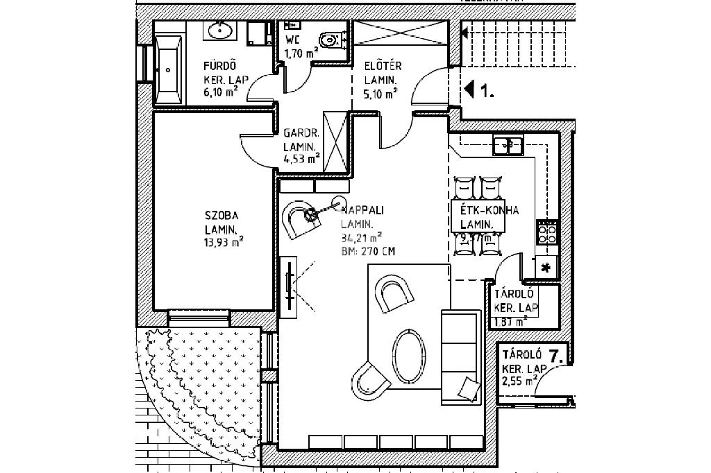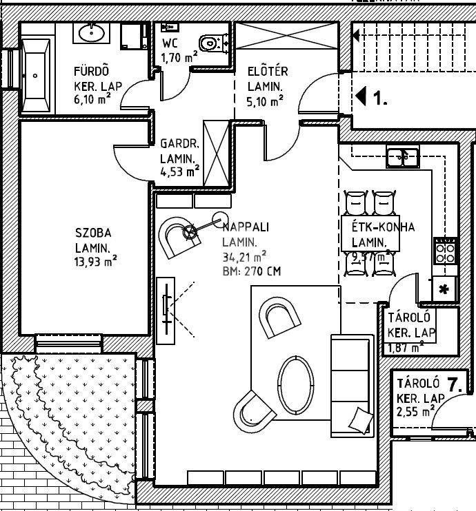 A lakásban tágas amerikai konyhás nappali, szoba, fürdőszoba, előszoba, gardrób, tároló és mellékhelyiség kerül kialakításra.