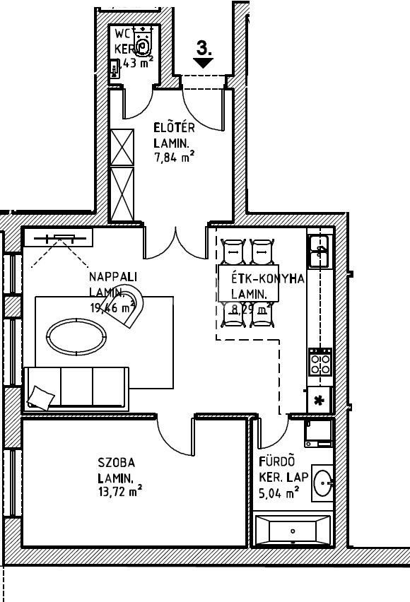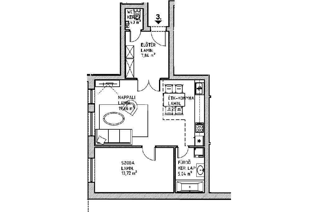 A lakásban tágas amerikai konyhás nappali, 2 szoba, fürdőszoba, előszoba és közlekedő kerül kialakításra.