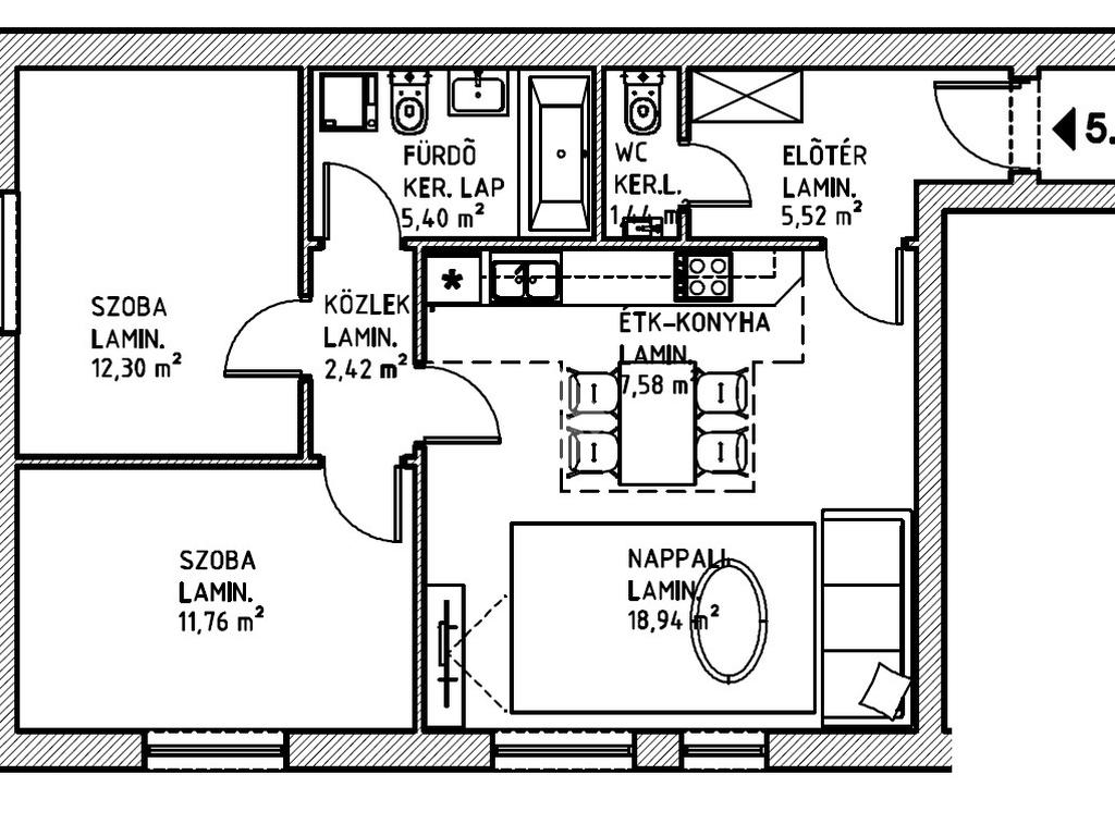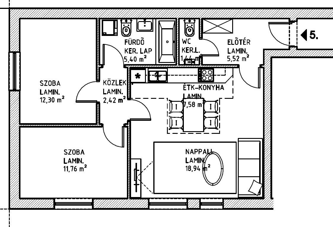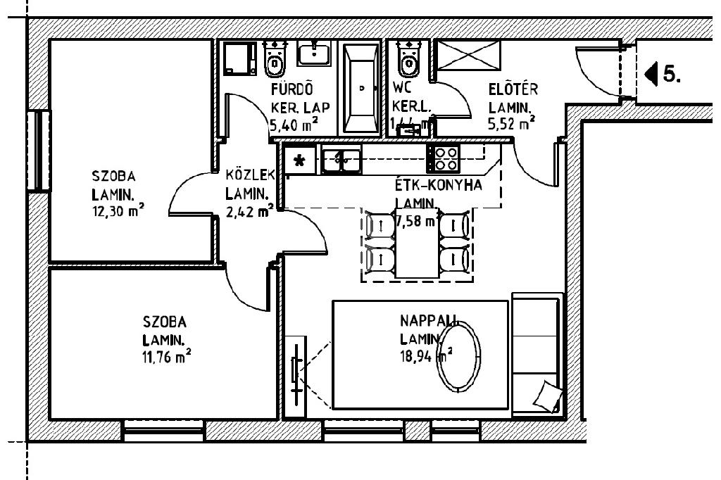A lakásban tágas amerikai konyhás nappali, 2 szoba, fürdőszoba, előszoba, közlekedő és mellékhelyiség kerül kialakításra.
